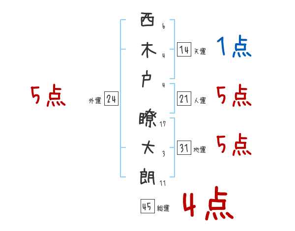 外運![]() | 西木戸瞭大朗さんの外運は24画の5つ星!家庭運が良く順調な人生。金運にも恵まれる。 生活面を象徴する運勢です。外部から受ける影響力を表し、結婚運、家庭運や職場、環境への順応性を表します。 |