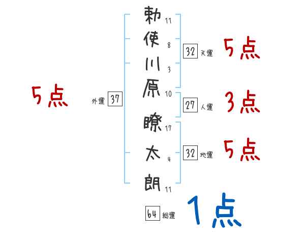 天運![]() | 勅使川原瞭太朗さんの天運は32画の5つ星!柔軟性があり成功する。チャンスが多く金運が良い。 家系が持つ宿命的な運勢を表します。祖先から受け継いだ苗字ですので自分の力が及びません。家柄を象徴します。 |