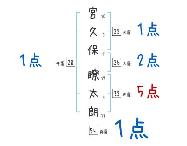 総運![]() | 宮久保瞭太朗さんの総運は54画の1つ星!トラブルが多いかも。周りをよく見て協調して過ごしましょう。 あなたの人生を表す1番重要な運勢です。生涯を通じて影響する総合運となり、主に50歳以降の晩年期に影響を及ぼします。 |