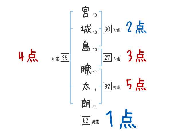 天運![]() | 宮城島瞭太朗さんの天運は30画の2つ星!浮き沈みの激しさに注意しましょう。 家系が持つ宿命的な運勢を表します。祖先から受け継いだ苗字ですので自分の力が及びません。家柄を象徴します。 |