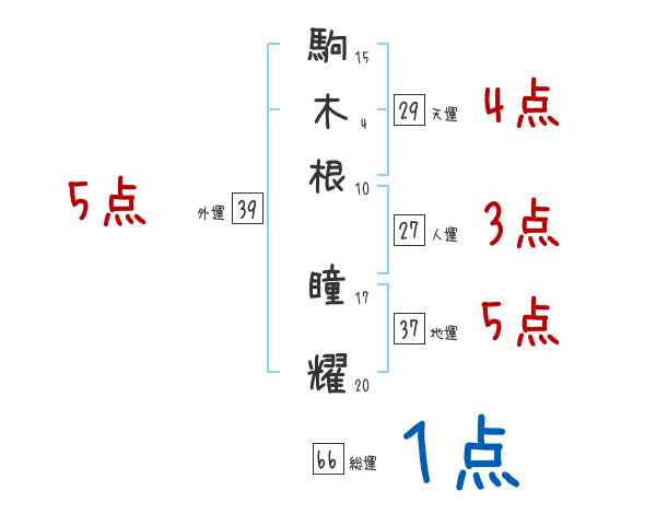 外運![]() | 駒木根瞳耀さんの外運は39画の5つ星!社交性に優れ人望が厚い。人の上に立ち成功する。 生活面を象徴する運勢です。外部から受ける影響力を表し、結婚運、家庭運や職場、環境への順応性を表します。 |