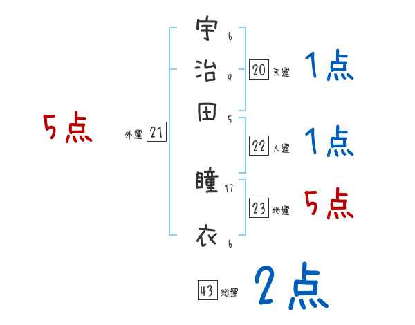 人運![]() | 宇治田瞳衣さんの人運は22画の1つ星!努力することが苦手ないっぽう手先が器用。芸術性にも優れる。 性格や才能などを表す2番目に重要な運勢です。人間関係や協調性、社会的な成功に影響します。主に20歳から50歳ぐらいまでの中年期の運勢を表します。 |