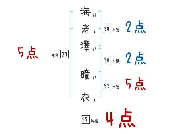 外運![]() | 海老澤瞳衣さんの外運は23画の5つ星!想像力に優れ活力がある。一代で成功し名誉を手に入れる。 生活面を象徴する運勢です。外部から受ける影響力を表し、結婚運、家庭運や職場、環境への順応性を表します。 |