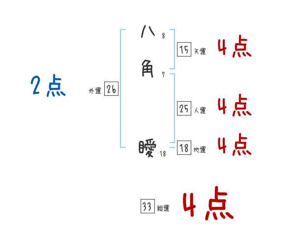 天運![]() | 八角瞹さんの天運は15画の4つ星!人徳があり出世する。順調に物事を進め円満な人生。 家系が持つ宿命的な運勢を表します。祖先から受け継いだ苗字ですので自分の力が及びません。家柄を象徴します。 |