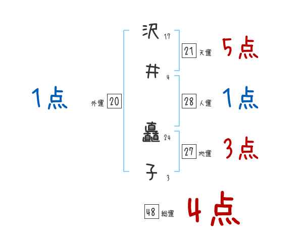 天運![]() | 沢井矗子さんの天運は21画の5つ星!統率力がある。独立し成功する。名誉を手に入れる。 家系が持つ宿命的な運勢を表します。祖先から受け継いだ苗字ですので自分の力が及びません。家柄を象徴します。 |
