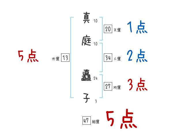 外運![]() | 真庭矗子さんの外運は13画の5つ星!才能に恵まれ人気がある。名声を手に入れる。円満な人生。 生活面を象徴する運勢です。外部から受ける影響力を表し、結婚運、家庭運や職場、環境への順応性を表します。 |