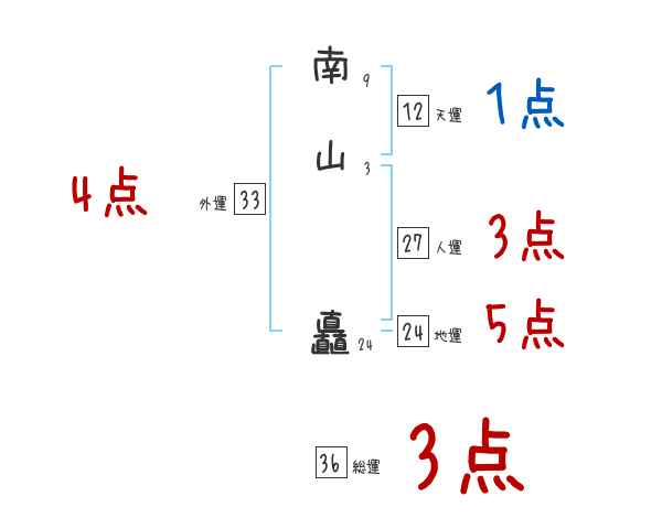 外運![]() | 南山矗さんの外運は33画の4つ星!権力志向でプライドが高い。勇気があり運を切り開き成功する。 生活面を象徴する運勢です。外部から受ける影響力を表し、結婚運、家庭運や職場、環境への順応性を表します。 |