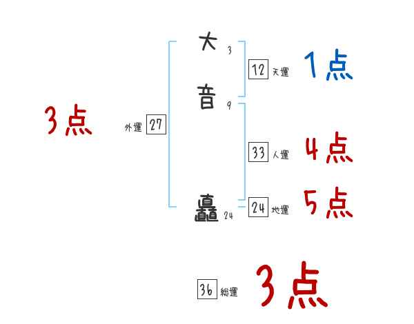 総運![]() | 大音矗さんの総運は36画の3つ星!先見性が豊かです。多少神経質で苦労することも。 あなたの人生を表す1番重要な運勢です。生涯を通じて影響する総合運となり、主に50歳以降の晩年期に影響を及ぼします。 |