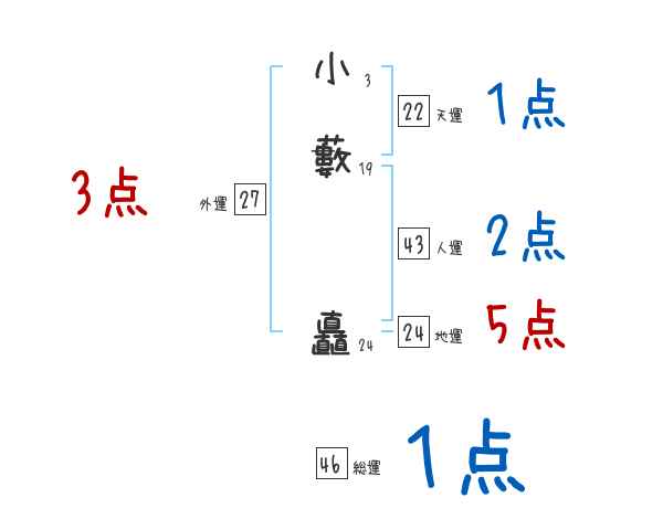 天運![]() | 小藪矗さんの天運は22画の1つ星!努力することが苦手ないっぽう手先が器用。芸術性にも優れる。 家系が持つ宿命的な運勢を表します。祖先から受け継いだ苗字ですので自分の力が及びません。家柄を象徴します。 |