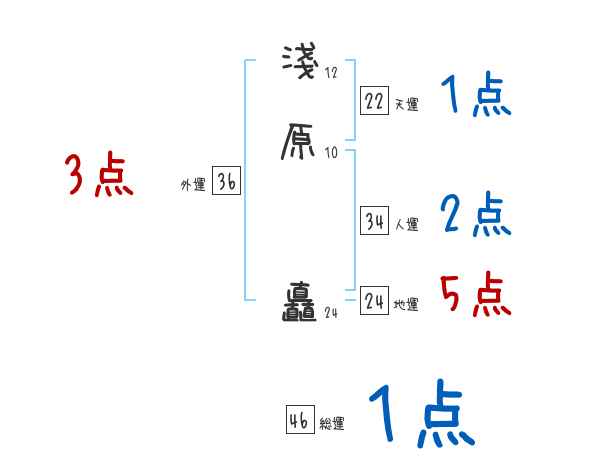 天運![]() | 淺原矗さんの天運は22画の1つ星!努力することが苦手ないっぽう手先が器用。芸術性にも優れる。 家系が持つ宿命的な運勢を表します。祖先から受け継いだ苗字ですので自分の力が及びません。家柄を象徴します。 |