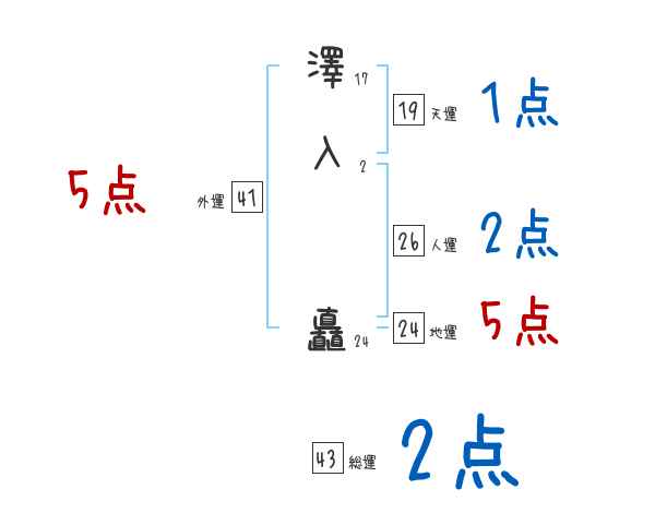 総運![]() | 澤入矗さんの総運は43画の2つ星!頑固な性格で独立心が強いかも。やや非現実的で浪費に注意しましょう。 あなたの人生を表す1番重要な運勢です。生涯を通じて影響する総合運となり、主に50歳以降の晩年期に影響を及ぼします。 |