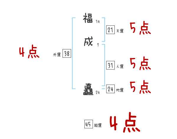 天運![]() | 福成矗さんの天運は21画の5つ星!統率力がある。独立し成功する。名誉を手に入れる。 家系が持つ宿命的な運勢を表します。祖先から受け継いだ苗字ですので自分の力が及びません。家柄を象徴します。 |