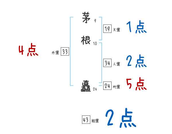 総運![]() | 茅根矗さんの総運は43画の2つ星!頑固な性格で独立心が強いかも。やや非現実的で浪費に注意しましょう。 あなたの人生を表す1番重要な運勢です。生涯を通じて影響する総合運となり、主に50歳以降の晩年期に影響を及ぼします。 |