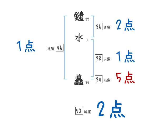総運![]() | 鑓水矗さんの総運は50画の2つ星!浮き沈みが激しく不安定。しりすぼみに衰退しやすいので注意しましょう。 あなたの人生を表す1番重要な運勢です。生涯を通じて影響する総合運となり、主に50歳以降の晩年期に影響を及ぼします。 |
