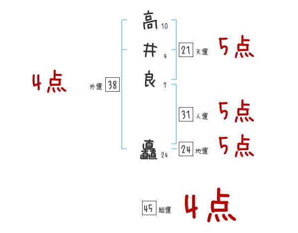 天運![]() | 高井良矗さんの天運は21画の5つ星!統率力がある。独立し成功する。名誉を手に入れる。 家系が持つ宿命的な運勢を表します。祖先から受け継いだ苗字ですので自分の力が及びません。家柄を象徴します。 |