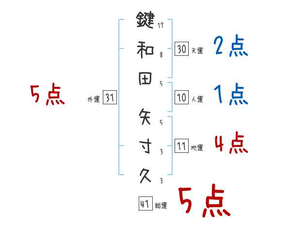 天運![]() | 鍵和田矢寸久さんの天運は30画の2つ星!浮き沈みの激しさに注意しましょう。 家系が持つ宿命的な運勢を表します。祖先から受け継いだ苗字ですので自分の力が及びません。家柄を象徴します。 |