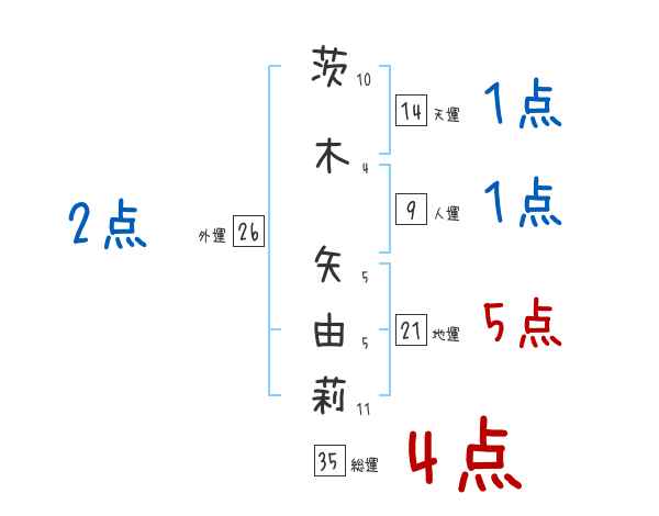 外運![]() | 茨木矢由莉さんの外運は26画の2つ星!波瀾万丈かも。信頼できる人を大事にしましょう。 生活面を象徴する運勢です。外部から受ける影響力を表し、結婚運、家庭運や職場、環境への順応性を表します。 |