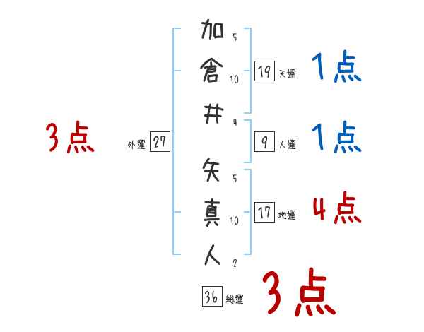 総運![]() | 加倉井矢真人さんの総運は36画の3つ星!先見性が豊かです。多少神経質で苦労することも。 あなたの人生を表す1番重要な運勢です。生涯を通じて影響する総合運となり、主に50歳以降の晩年期に影響を及ぼします。 |