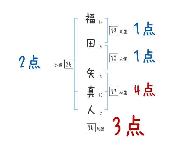天運![]() | 福田矢真人さんの天運は19画の1つ星!優れた才能を持ちますが、協調性が足りないことも。周りの人と協力する事を意識しましょう。 家系が持つ宿命的な運勢を表します。祖先から受け継いだ苗字ですので自分の力が及びません。家柄を象徴します。 |