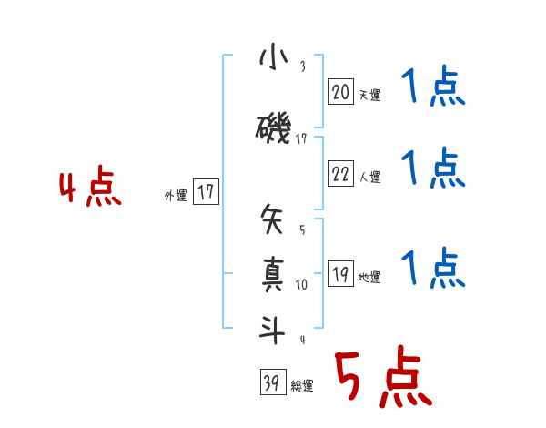 外運![]() | 小磯矢真斗さんの外運は17画の4つ星!積極的な行動力。地位を気づき財産を手に入れる。純粋な心と直感力。 生活面を象徴する運勢です。外部から受ける影響力を表し、結婚運、家庭運や職場、環境への順応性を表します。 |