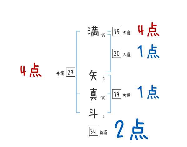 外運![]() | 満矢真斗さんの外運は29画の4つ星!完全主義で才能がある。厳格な心の持ち主。 生活面を象徴する運勢です。外部から受ける影響力を表し、結婚運、家庭運や職場、環境への順応性を表します。 |