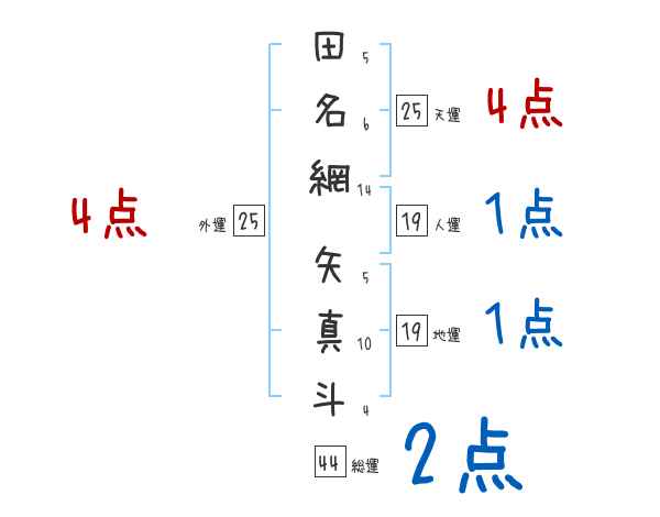 総運![]() | 田名網矢真斗さんの総運は44画の2つ星!誠実で慎重な性格。物事を考えすぎないように注意しましょう。 あなたの人生を表す1番重要な運勢です。生涯を通じて影響する総合運となり、主に50歳以降の晩年期に影響を及ぼします。 |