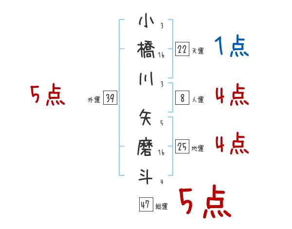 外運![]() | 小橋川矢磨斗さんの外運は39画の5つ星!社交性に優れ人望が厚い。人の上に立ち成功する。 生活面を象徴する運勢です。外部から受ける影響力を表し、結婚運、家庭運や職場、環境への順応性を表します。 |