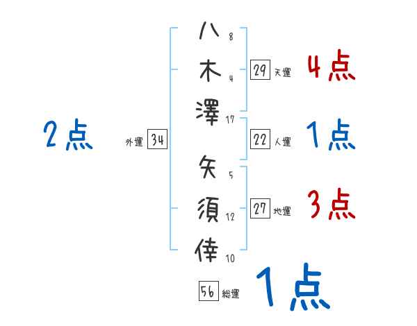 天運![]() | 八木澤矢須倖さんの天運は29画の4つ星!完全主義で才能がある。厳格な心の持ち主。 家系が持つ宿命的な運勢を表します。祖先から受け継いだ苗字ですので自分の力が及びません。家柄を象徴します。 |