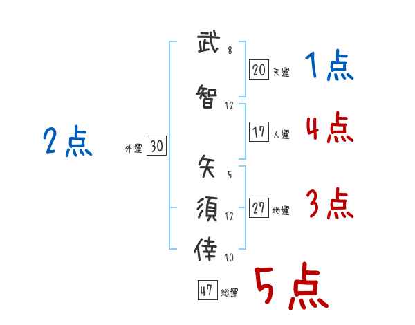 総運![]() | 武智矢須倖さんの総運は47画の5つ星!実力が開花し発展する円満な人生。財に恵まれる。 あなたの人生を表す1番重要な運勢です。生涯を通じて影響する総合運となり、主に50歳以降の晩年期に影響を及ぼします。 |