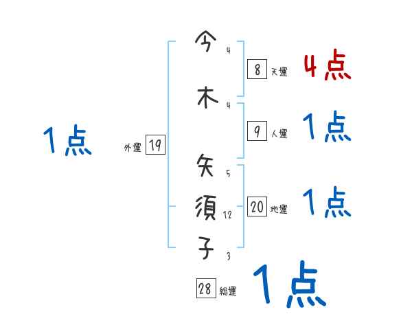 天運![]() | 今木矢須子さんの天運は8画の4つ星!勤勉家。根気強く努力し成功する。忍耐力がある。 家系が持つ宿命的な運勢を表します。祖先から受け継いだ苗字ですので自分の力が及びません。家柄を象徴します。 |