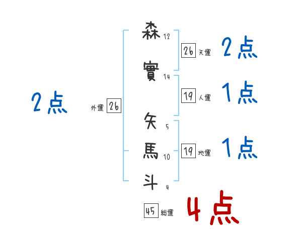 外運![]() | 森實矢馬斗さんの外運は26画の2つ星!波瀾万丈かも。信頼できる人を大事にしましょう。 生活面を象徴する運勢です。外部から受ける影響力を表し、結婚運、家庭運や職場、環境への順応性を表します。 |