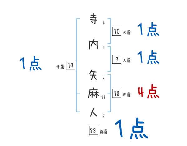 地運![]() | 寺内矢麻人さんの地運は18画の4つ星!情熱的で剛気。忍耐力があり信頼される。 個性を表す基礎的な運勢です。性格形成や対人関係、行動力など家庭環境に影響されます。主に誕生してから20歳くらいまでの若年期の運勢を表します。 |