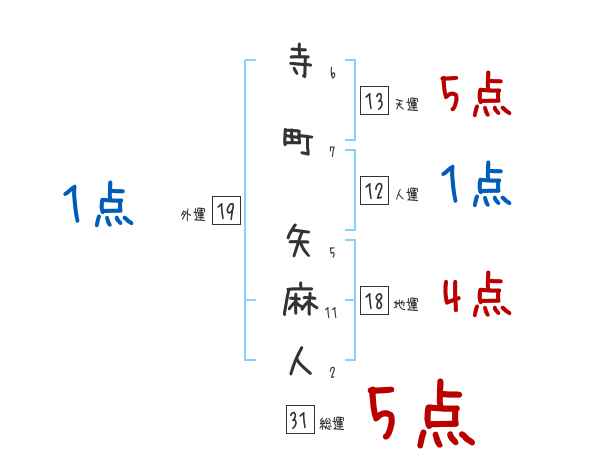 外運![]() | 寺町矢麻人さんの外運は19画の1つ星!優れた才能を持ちますが、協調性が足りないことも。周りの人と協力する事を意識しましょう。 生活面を象徴する運勢です。外部から受ける影響力を表し、結婚運、家庭運や職場、環境への順応性を表します。 |