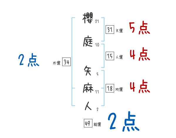 天運![]() | 櫻庭矢麻人さんの天運は31画の5つ星!社交性があり判断力に優れる。順風満帆な人生で円満な生活。 家系が持つ宿命的な運勢を表します。祖先から受け継いだ苗字ですので自分の力が及びません。家柄を象徴します。 |
