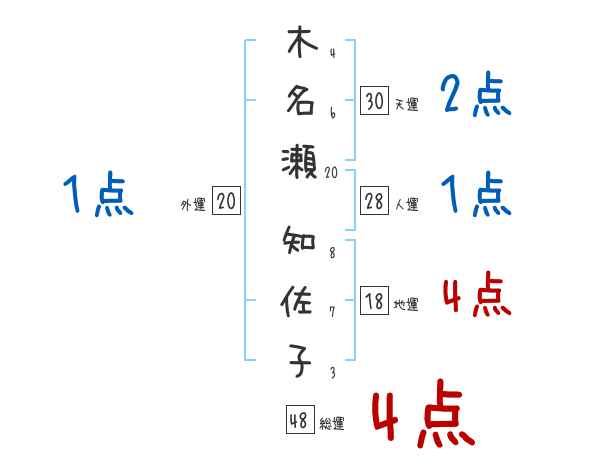 天運![]() | 木名瀬知佐子さんの天運は30画の2つ星!浮き沈みの激しさに注意しましょう。 家系が持つ宿命的な運勢を表します。祖先から受け継いだ苗字ですので自分の力が及びません。家柄を象徴します。 |