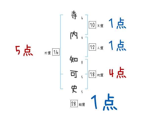 外運![]() | 寺内知可史さんの外運は16画の5つ星!人望が厚く大きく発展する。逆転成功が見える。 生活面を象徴する運勢です。外部から受ける影響力を表し、結婚運、家庭運や職場、環境への順応性を表します。 |