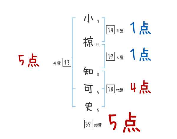 総運![]() | 小掠知可史さんの総運は32画の5つ星!柔軟性があり成功する。チャンスが多く金運が良い。 あなたの人生を表す1番重要な運勢です。生涯を通じて影響する総合運となり、主に50歳以降の晩年期に影響を及ぼします。 |