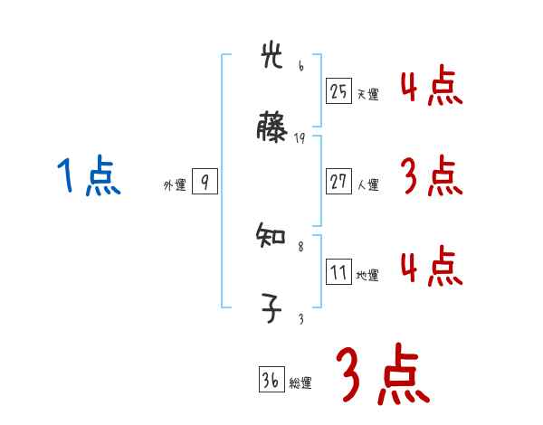 総運![]() | 光藤知子さんの総運は36画の3つ星!先見性が豊かです。多少神経質で苦労することも。 あなたの人生を表す1番重要な運勢です。生涯を通じて影響する総合運となり、主に50歳以降の晩年期に影響を及ぼします。 |