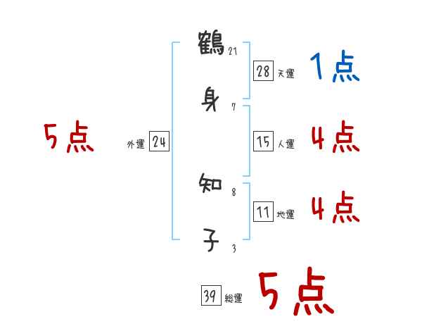 天運![]() | 鶴身知子さんの天運は28画の1つ星!家庭環境に注意。スポーツで活躍できる能力があるかも。 家系が持つ宿命的な運勢を表します。祖先から受け継いだ苗字ですので自分の力が及びません。家柄を象徴します。 |