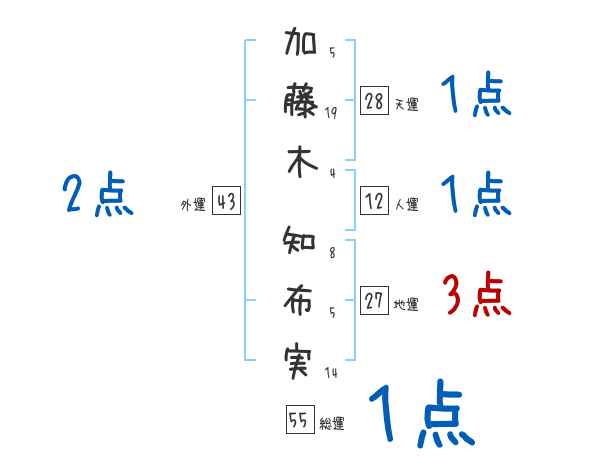 天運![]() | 加藤木知布実さんの天運は28画の1つ星!家庭環境に注意。スポーツで活躍できる能力があるかも。 家系が持つ宿命的な運勢を表します。祖先から受け継いだ苗字ですので自分の力が及びません。家柄を象徴します。 |