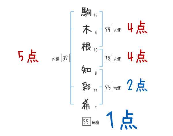外運![]() | 駒木根知彩希さんの外運は37画の5つ星!努力家で順応性に優れる。現実的な考え方ができ忠実に物事をこなす。 生活面を象徴する運勢です。外部から受ける影響力を表し、結婚運、家庭運や職場、環境への順応性を表します。 |