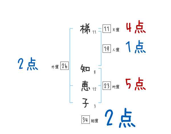 天運![]() | 梯知恵子さんの天運は11画の4つ星!着実に富や地位を得る幸運な人生。 家系が持つ宿命的な運勢を表します。祖先から受け継いだ苗字ですので自分の力が及びません。家柄を象徴します。 |