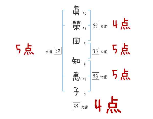 天運![]() | 眞榮田知恵子さんの天運は29画の4つ星!完全主義で才能がある。厳格な心の持ち主。 家系が持つ宿命的な運勢を表します。祖先から受け継いだ苗字ですので自分の力が及びません。家柄を象徴します。 |