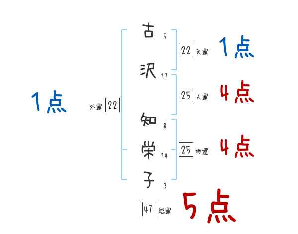 天運![]() | 古沢知栄子さんの天運は22画の1つ星!努力することが苦手ないっぽう手先が器用。芸術性にも優れる。 家系が持つ宿命的な運勢を表します。祖先から受け継いだ苗字ですので自分の力が及びません。家柄を象徴します。 |