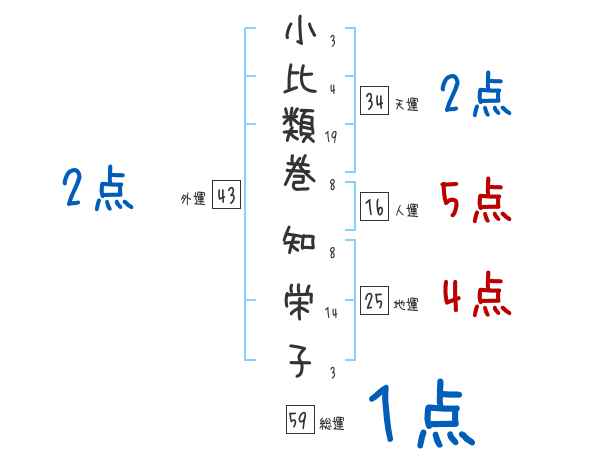 人運![]() | 小比類巻知栄子さんの人運は16画の5つ星!人望が厚く大きく発展する。逆転成功が見える。 性格や才能などを表す2番目に重要な運勢です。人間関係や協調性、社会的な成功に影響します。主に20歳から50歳ぐらいまでの中年期の運勢を表します。 |