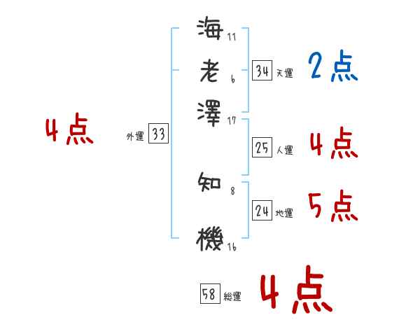 総運![]() | 海老澤知機さんの総運は58画の4つ星!安定した生活。大器晩成タイプ。 あなたの人生を表す1番重要な運勢です。生涯を通じて影響する総合運となり、主に50歳以降の晩年期に影響を及ぼします。 |