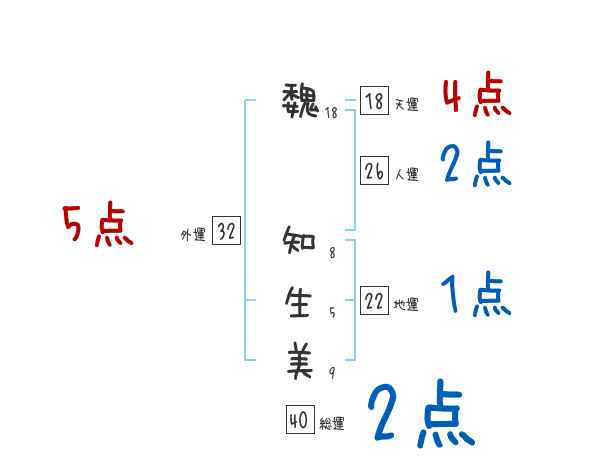 天運![]() | 魏知生美さんの天運は18画の4つ星!情熱的で剛気。忍耐力があり信頼される。 家系が持つ宿命的な運勢を表します。祖先から受け継いだ苗字ですので自分の力が及びません。家柄を象徴します。 |
