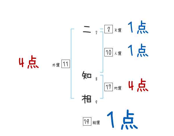 天運![]() | 二知相さんの天運は2画の1つ星!優しいですが積極性や意思の強さに欠ける傾向があります。家庭環境の乱れに注意しましょう。 家系が持つ宿命的な運勢を表します。祖先から受け継いだ苗字ですので自分の力が及びません。家柄を象徴します。 |