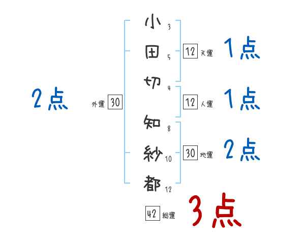 総運![]() | 小田切知紗都さんの総運は42画の3つ星!病気に注意。多芸であるが消極的でおとなしい。 あなたの人生を表す1番重要な運勢です。生涯を通じて影響する総合運となり、主に50歳以降の晩年期に影響を及ぼします。 |