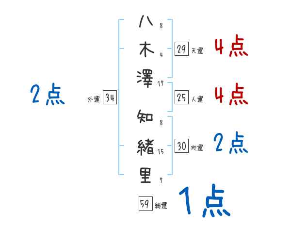天運![]() | 八木澤知緒里さんの天運は29画の4つ星!完全主義で才能がある。厳格な心の持ち主。 家系が持つ宿命的な運勢を表します。祖先から受け継いだ苗字ですので自分の力が及びません。家柄を象徴します。 |